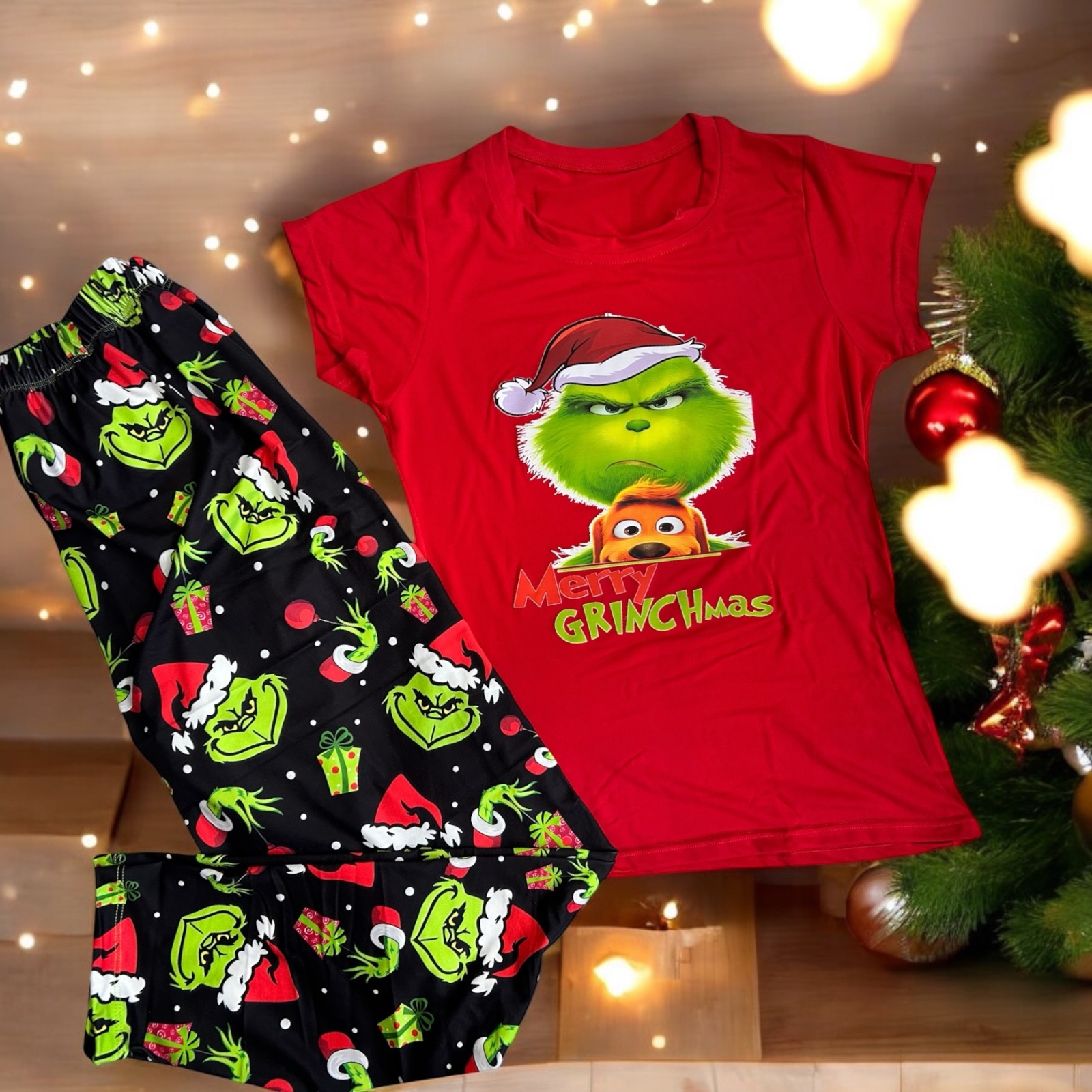 cómodas pijamas elaboradas en piel de durazno, dos piezas, pantalón estampado de color negro y camiseta estampada grinch.